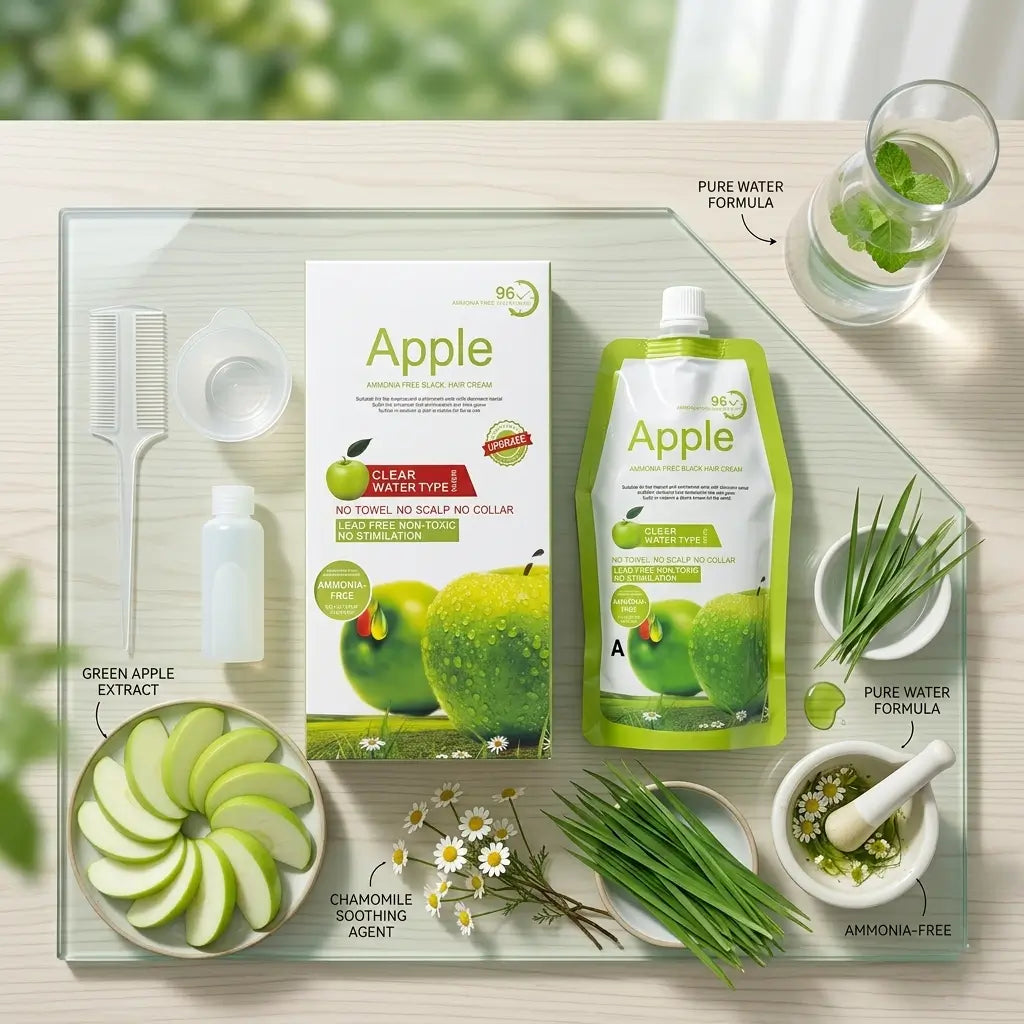 A gentle, ammonia-free hair color infused with green apple extracts. It uses "Clear Water" technology to give you vibrant results without staining your skin, towels, or clothes. Simply apply, rinse, and enjoy soft, shiny hair with a fresh apple scent.